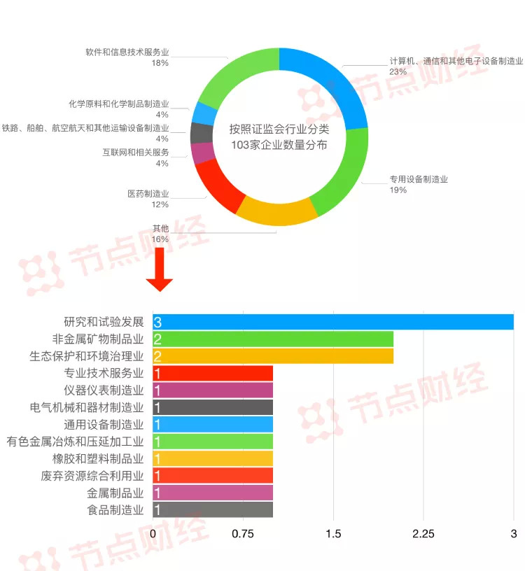 据统计,受理的103家企业中,按照证监会行业分类,计算机通信和其他电子设备制造业有24家,占比最高,占到23%;专用设备制造业有20家,占比19%;软件和信息技术服务业有19家。