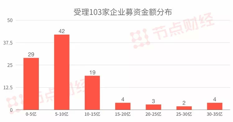 从募资金额分布来看,103家企业募资金额集中在15亿元以下。除了中国铁路通信信号股份有限公司募资金额达到105亿元以外,第二高的杭可科技募资金额不到前者的一半。