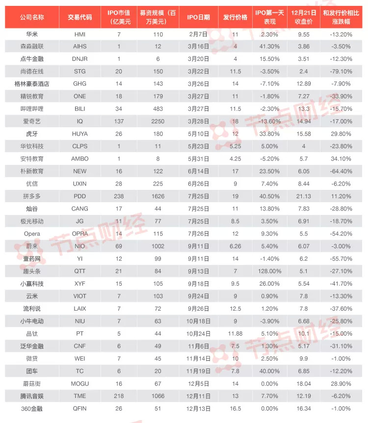 据统计,2018年中概股赴美IPO的企业共计33家,创历年新高。除去SPAC形式上市之外,31家公司共计募资89亿美元。