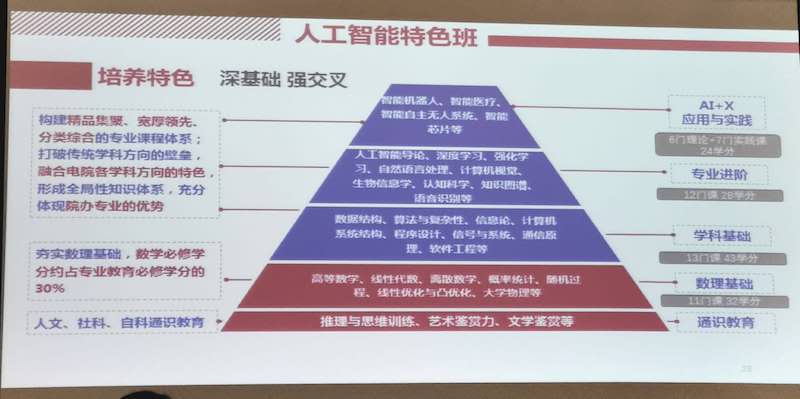 而人工智能特色班的目标是面向国家“创新驱动发展战略”与“新一代人工智能发展规划”的需求,培养具有社会责任感、创新精神、实践能力、人文情怀和全球视野的卓越创新人才,探索人工智能基础研究拔尖人才和交叉应用高端人才培养的新模式。