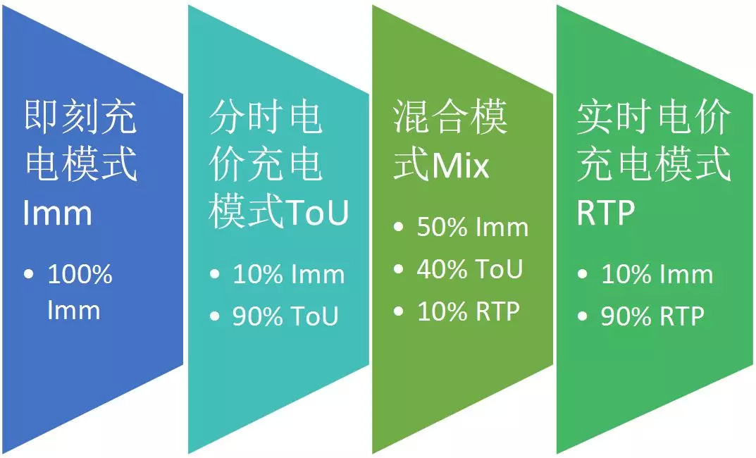 电动车充电模式可分为四种:即刻充电模式(Immediatescenario,Imm)、分时电价充电模式(Time-of-use,ToU)、实时电价充电模式(RealtimePrice,RTP)和混合充电模式(Mix)。即刻充电模式也就是电动车什么时候到什么时候充电的模式,是一种随意行为模式。分时电价充电模式和实时电价充电模式则运用了电价激励措施改变了人们的充电行为。分时电价充电模式将引导人们按照静态的固定价格表在时间允许范围内最低电价时充电。实时电价充电模式将按照随每小时不停变化的实时电价引导人们在时间允许范围内最低电价时充电。在实际运行过程中,考虑到电动车必须在到达充电桩和离开充电桩之间充电,分时电价充电模式和实时电价充电模式下,仍然会有即刻充电的存在。