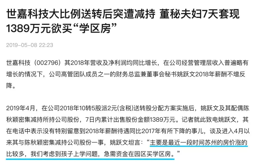 房价高涨,也成了很多科技公司高管担心的事情。近日,某科技公司董秘夫妇在管理层普遍收入略有增长的情况下,大幅减持该公司股票套现千万,该董秘夫妇坦言,这番无奈举措只是为了购买苏州工业园的学区房。