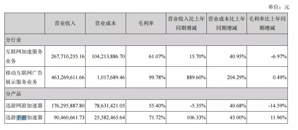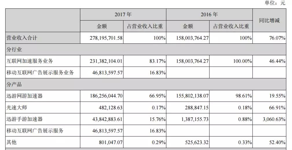 根据财报数据显示,迅游2018年互联网加速服务业务的收入为2.67亿元,同比增长了15.7%,其中PC端的业务出现了5.35%的下滑,但依旧是其游戏加速服务的主要收入来源,而手游端的收入为0.9亿元,同比增长达到了106.33%。