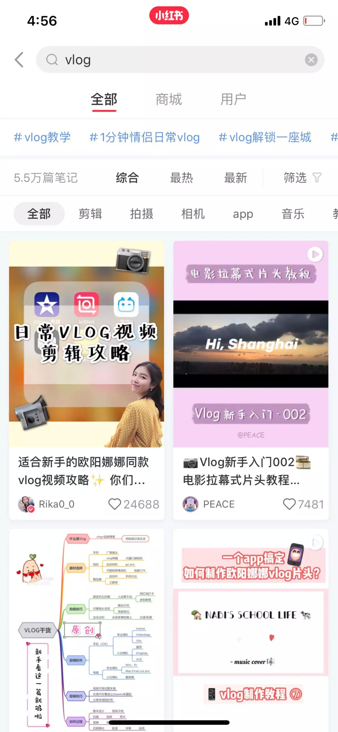 锌财经在小红书搜索“Vlog”,有5.5万个笔记。Vlog成为小红书流量的重要载体,但雷同度相当高,相当一部分是穿搭和出行的Vlog。