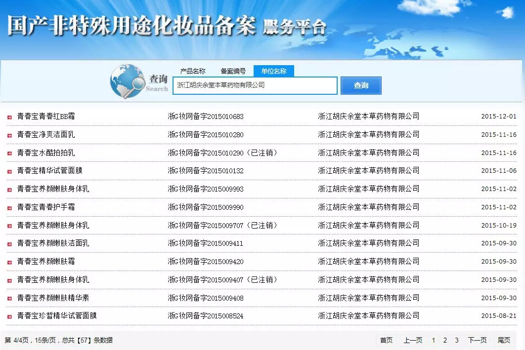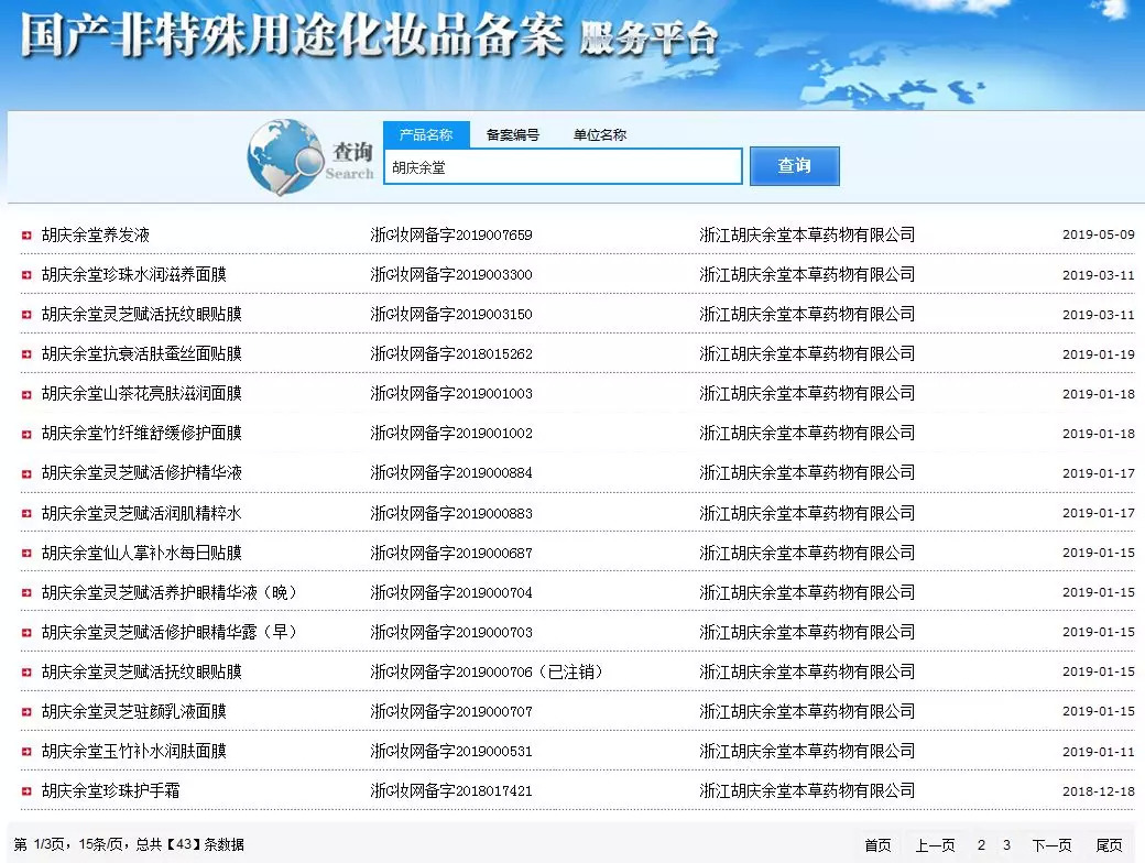 大耳朵在国产非特殊用途化妆品备案服务平台查询到,胡庆余堂品牌旗下化妆品最早备案时间为2016年9月,是一款叫胡庆余堂擦面玉容膜的产品。备案服务平台页面显示,胡庆余堂生产的化妆品涵盖珍珠粉、洁面乳、精华、眼膜、足膜、手膜、面膜、唇霜、手足霜等多种产品。
