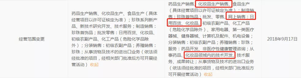 根据备案系统显示,胡庆余堂化妆品的实际生产企业即为上述浙江胡庆余堂公司。另外,根据企业公示系统,浙江胡庆余堂在2018年9月变更了经营范围,在化妆品生产和批发零售的基础上,增加了“化妆品销售、网上销售及化妆品领域的技术开发”。