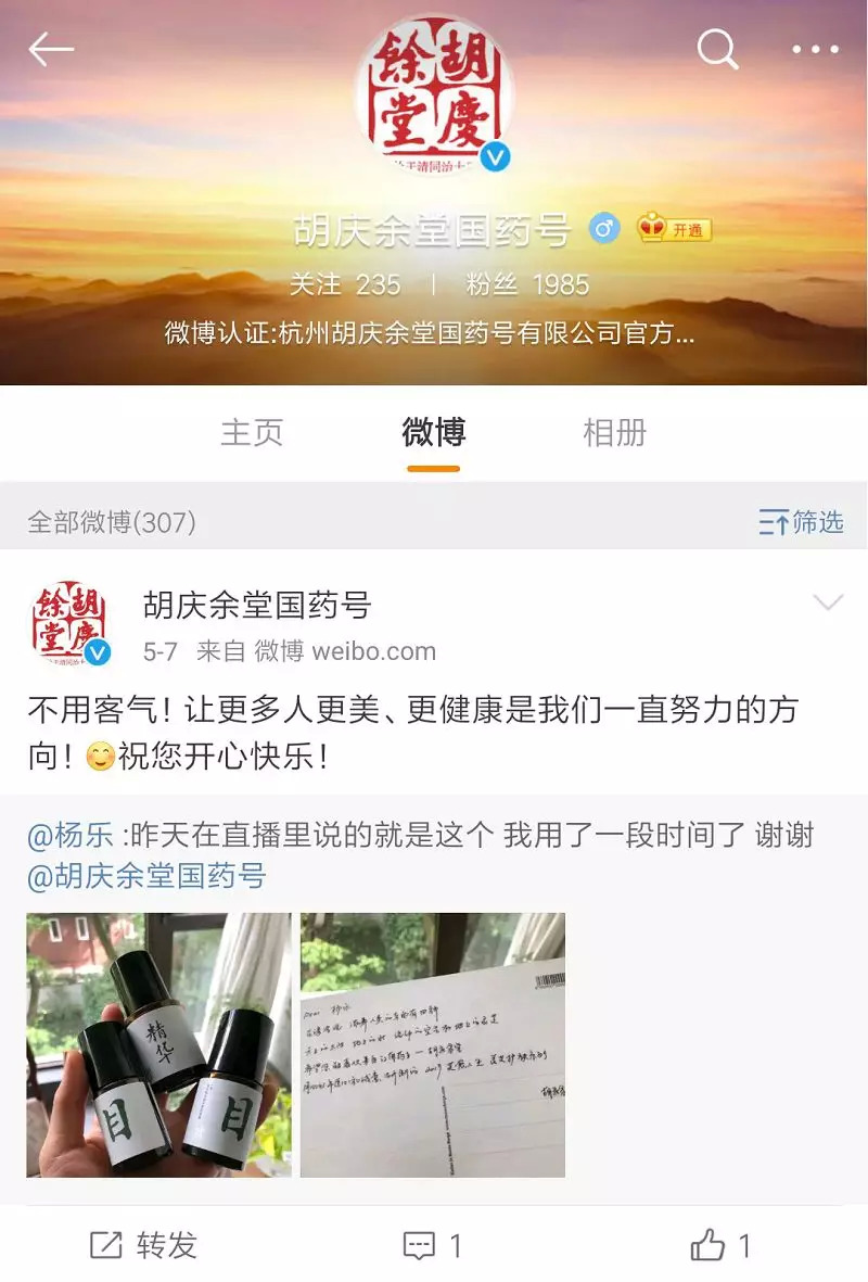 另外,大耳朵发现,该账号今年4月25日才审核,粉丝数不过1985,第一条微博发送于2012年3月15日,8年共发送307条微博。这“佛系”的运营状态,和胡庆余堂在化妆品领域的推进进程如出一辙。