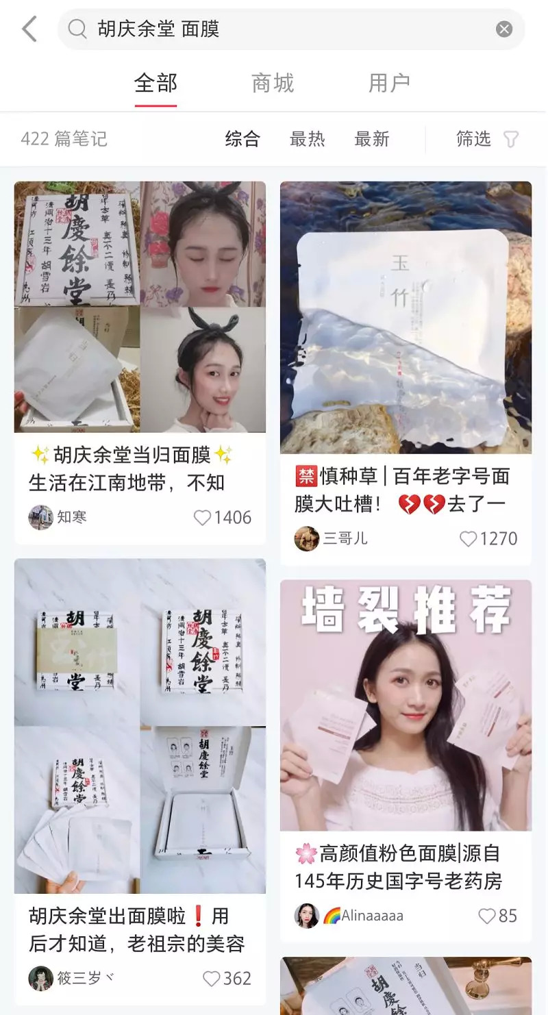 胡庆余堂化妆品不仅在几大社交平台悄无声息,在小红书、美妆心得等美妆分享平台也缺少点“存在感”。比如小红书上鲜少有关于胡庆余堂化妆品的笔记内容,其核心产品面膜的相关笔记也仅422篇。