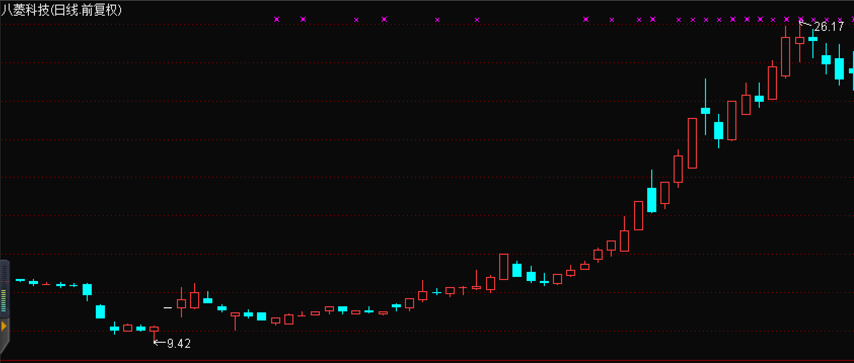 与引入车行天下出现这个时间点不同的是,计划引入南京红太阳之时,八菱科技的股价甚至跌到了10元以下。但在20元/股转让价格的刺激下,八菱科技止住了跌势拐头向上,短短两个月大涨了150%左右,股价冲击26元一线,表现抢眼。但最终,八菱科技与南京红太阳的暧昧因时限期满而终止。