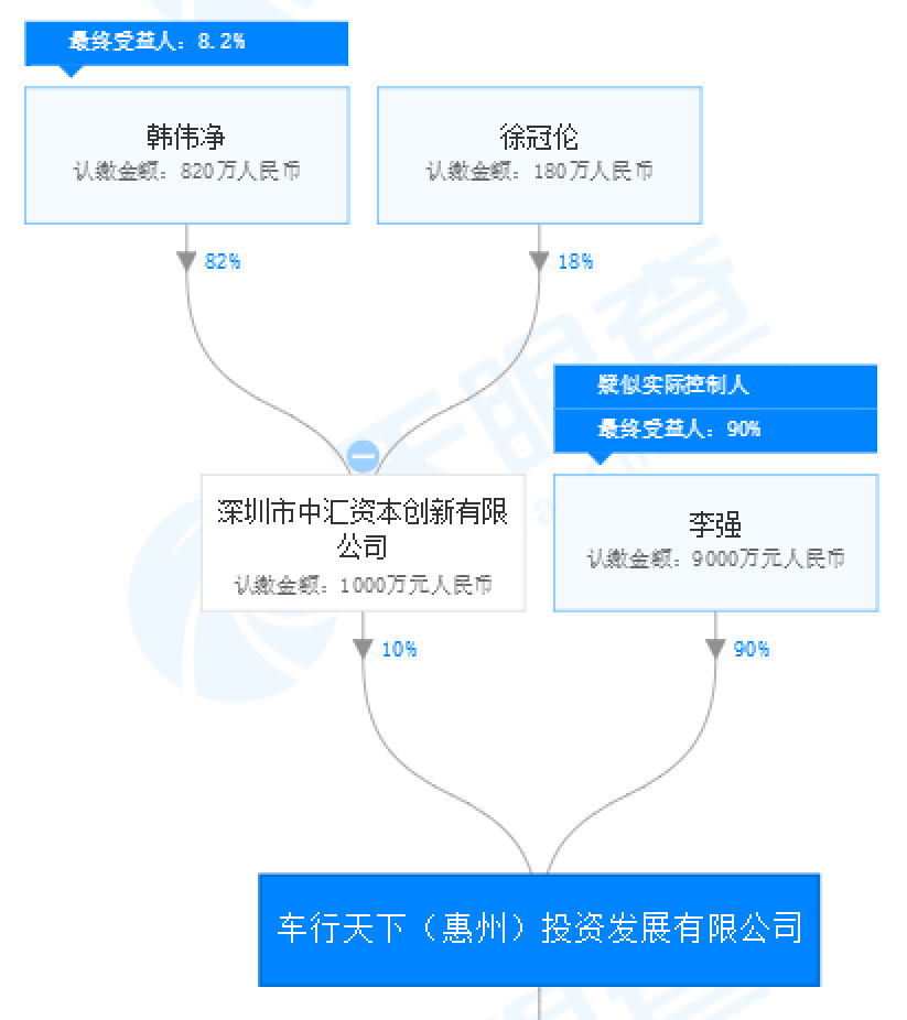 总计11%的股份对价不是小数目,为了能够履行向杨竞忠、顾瑜夫妇支付转让价款,车行天下需要通过增资等方式筹措资金。从天眼查资料可见,车行天下股东有李强(持股90%)和深圳市中汇资本创新有限公司(持股10%)。在2018年12月26日李强增资车行天下时就约定,增资的9000万元就是用于车行天下向杨竞忠和顾瑜支付股份转让价款,转让价款与车行天下实缴出资额之差额,由李强向车行天下提供借款。