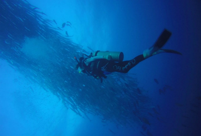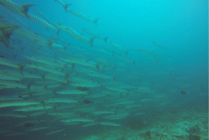 第一潜是在Barracuda Point,Barracuda就是梭子鱼,也叫海狼鱼,在诗巴丹的潜点中Barracuda Point顾名思义就是以海狼鱼群而闻名。第一潜在清晨(吃早餐前),正是鱼群活跃的时候,见识到了如风暴般围绕的海狼鱼群。这一个潜点的水流湍急,能够很明显地感觉到水下洋流的冷暖交替,除此之外,更有Jack fish风暴、白顶鲨鱼、巨大的海龟、Bumphead Parrotfish(隆头鹦鹉鱼)等等。
