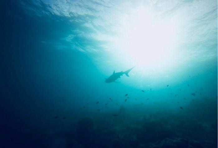 抬头看看水面的阳光和鲨鱼的剪影,觉得这个视角很独特,仿佛自己也是海洋生物中的一员。