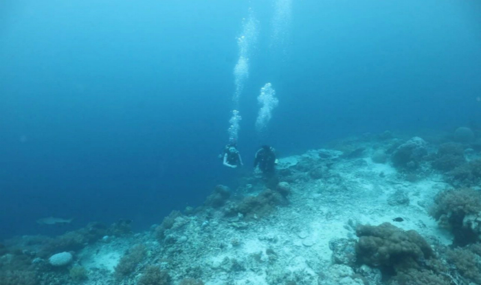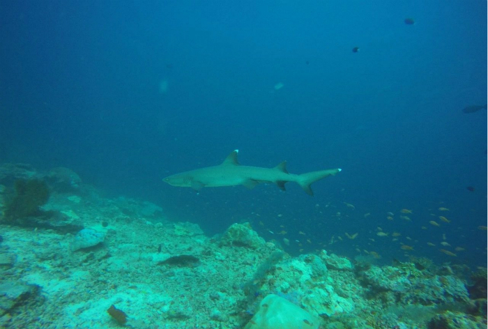 第二潜是在早餐过后,中礁的水流也比较急,并且我与教练是逆流而行,在18米深的珊瑚断崖边顶着迎面而来的冷洋流,有点辛苦,这是在四潜中感觉最累的一次。不过看到了白顶鲨鱼、Giant Clam巨型贝壳以及独特的珊瑚断崖的景象。