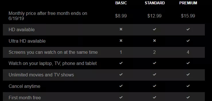 向Netflix等国外的流媒体订阅看齐,涨价或是推出多档次付费是否可行?这是用户总数量接近天花板时提升ARPU的最直接方法,但从实际情况来看,国内视频平台目前还在纷纷半价促销,短期内涨价显然不现实。此外,国内视频VIP会员也未必具备多档付费的条件,Netflix的$8.99、$12.99、$15.99区别如下: