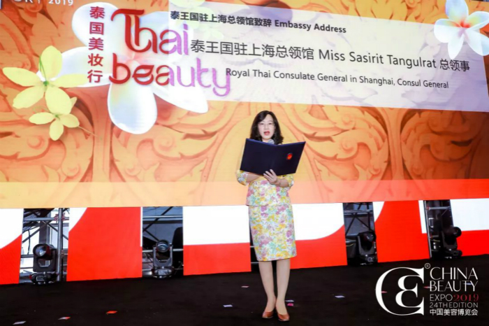 随后,泰王国驻上海总领馆总领事 Ms. Sasirit Tangulrat(飒丝黎•丹绲拉)上台致辞,她分享了中泰近些年来的一系列贸易数据,并表示,中国将是泰国重要的合作伙伴,同时对中泰美容行业抱以美好的期许。