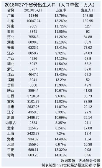 21世纪经济报道记者通过对27个已发布2018年人口数据的省份统计梳理发现,去年有广东、山东、河南3个省份的出生人口超过了100万大关,广东出生人口首次跃居榜首,山东出生人口量下滑明显。从出生率来看,西部边疆省份、华南、山东出生率较高,辽宁的自然增长率为负数。
