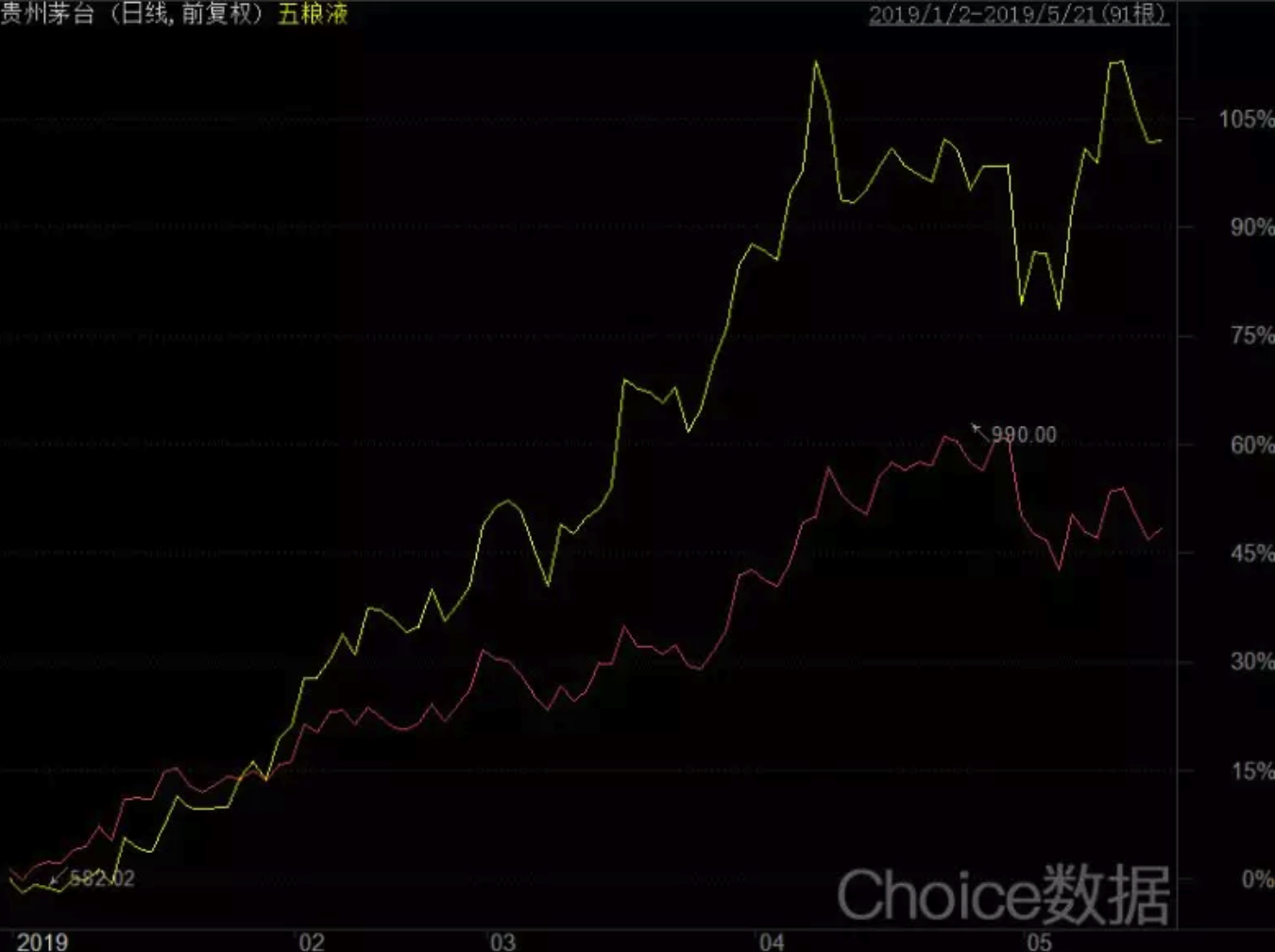 2019年初至今,五粮液的股价表现远超过茅台。