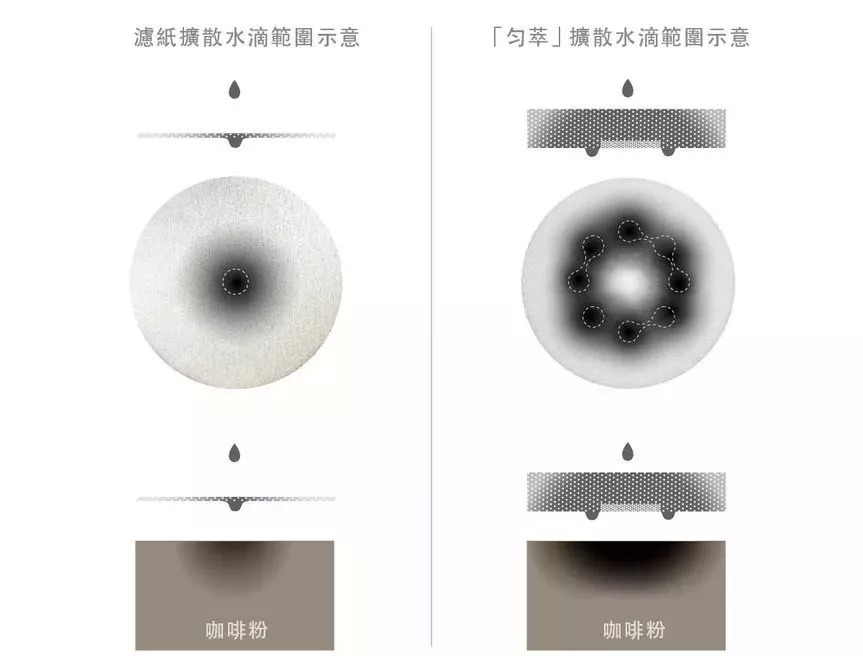 冰滴萃取的风味受萃取均匀度影响,传统冰滴系统通过滤纸做简单的单点扩散,虽然能起到扩散效果,但还远远达不到均匀。