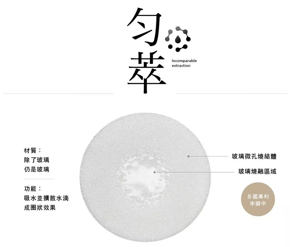 独特的匀萃玻璃分水片则能够吸水并扩散水滴成圈状效果,实现花洒般的分水能力,使被萃取物均匀浸湿,稳定萃取风味。