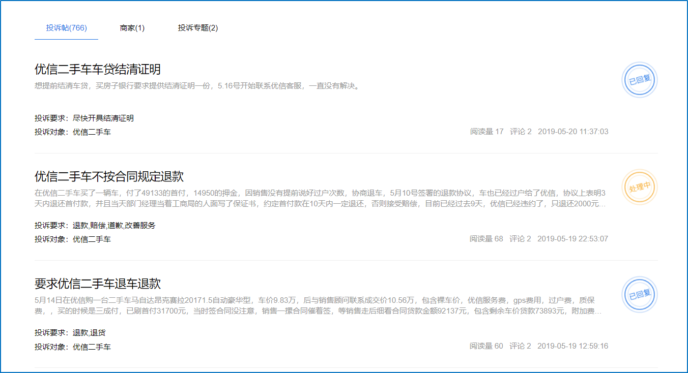 在二手车交易中,由于贷款引起的纠纷非常普遍,在21cn“聚投诉”上,关于优信二手车、美利车金融等机构的投诉随处可查。