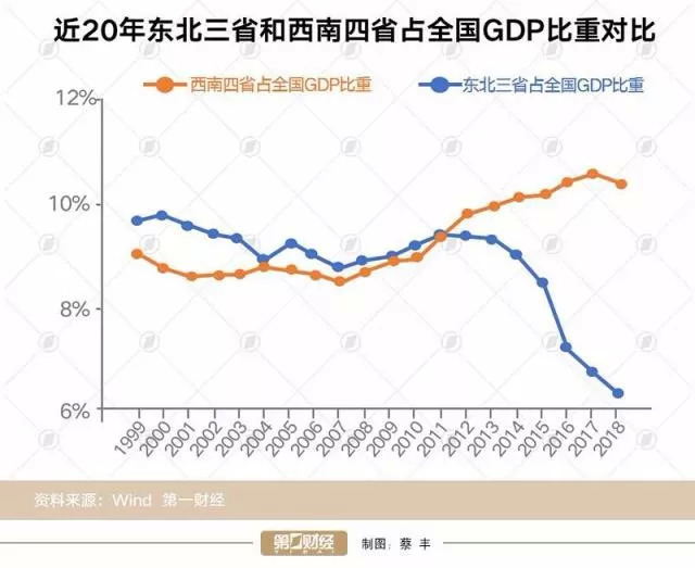 从1999年到2018年,重庆、四川、云南和贵州GDP分别增长了1124%、1015%、841%和1480%。同期,辽宁、吉林和黑龙江只分别增长了507%、801%和471%。东北地区和西南地区增长差距悬殊。