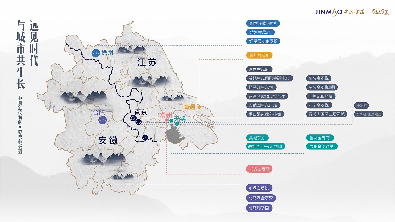 从深入南京,到广拓合肥、无锡,挺进徐州、常州、南通,从大家熟知的金茂府到精工品质著称的金茂悦、别墅理想生活进阶的金茂逸墅,再到南京青龙山国际生态新城、南京河西鱼嘴综合体、南京汤山温泉康养小镇、无锡徐霞客小镇等城市运营作品,中国金茂在苏皖已经形成自己的独特城市发展版图,以长三角世界级城市群的六大核心潜力城市为中心,城市运营战略逐步完成。