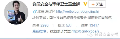 董金狮,1963年出生,陕西省大荔县人,常见介绍是“著名环境化学专家、食品安全专家,”其新浪博客自称“食品安全与环保卫士”。不过,资料显示他的最高学历为“环境化学硕士”。