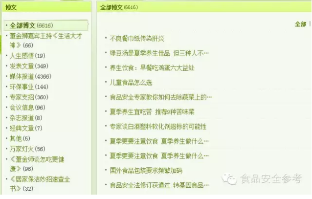 随手搜一下,董金狮对如下问题发表过专家观点:发泡餐具、方便面知识、勾兑饮品问题、奶瓶知识、活性炭工作原理、散装油安全知识、工业盐问题、苯胺爆炸事件、有机食品知识、白酒知识、羽绒服知识、瓷器知识、手机壳问题、转基因知识……总而言之,在食品安全、营养和环保相关领域,只有你想不到,没有董老师答不上来的。