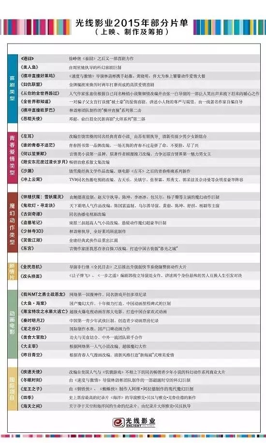 电影业的大笔加码,也可以看出光线对于电影事业的未来发展充满信心,这股信心的确是有基础。要知道在过去的2014年,光线传媒参与投资的电影获得了31.29亿的票房,,占全国国产电影161亿票房的19.5%,作为一个近年来崛起的电影公司占有近20%的票房成绩的确让人惊叹。