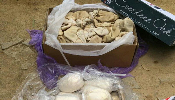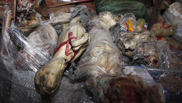 7. 执法人员在查获的冻肉中发现问题冻狗。