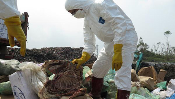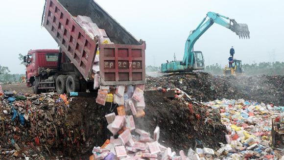3. 执法人员将查获的问题冻肉集中销毁,打私民警称“此前甚至还有二战时期一些国家为战争储备的冻品走私入境”。