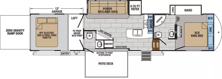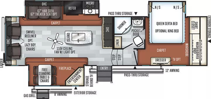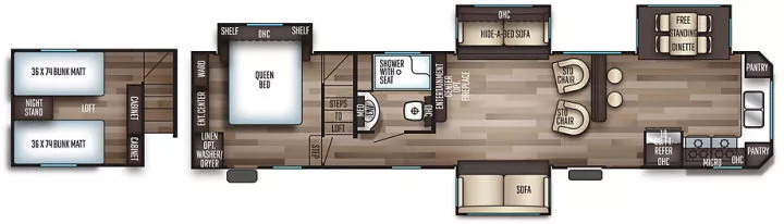 下图中Forest River公司的Rockwood 8299BS型房车,净重达到9500磅。因为采用Fifth wheel的设计,卧式和客厅/餐厅/洗手间之间还存在一个跃层——
