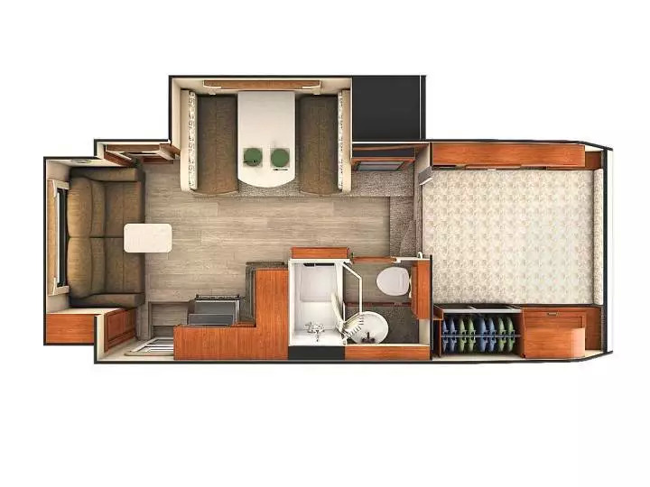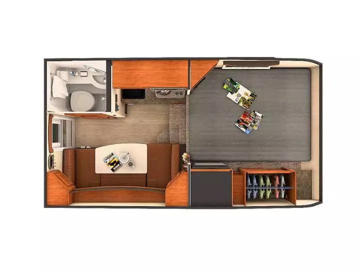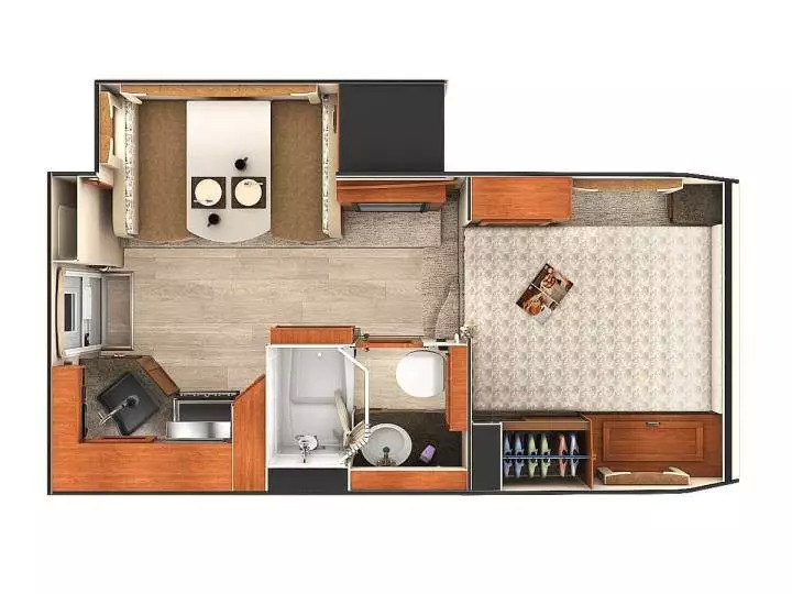 对于房车来说,既然重量如此宽裕,那么家具都可以采用正常住家的家具尺寸和重量,不用考虑轻量化,也不用考虑复用。比如这个级别房车床的躺卧方向都是垂直于汽车行进方向的,这样就可以不受车宽的限制,做出2米宽的国王级大床。餐桌餐椅也不再是卡座,而是正常的实木桌椅,客厅的沙发也不再考虑兼顾作床。整个客厅还不用考虑兼顾睡卧,而成为一个正经的客厅,加上全封闭的卧式,就是真正的一室一厅。将可扩展部分推出后,空间有一定的开扬感,总共能有20多平米的面积了,可以正经常住。