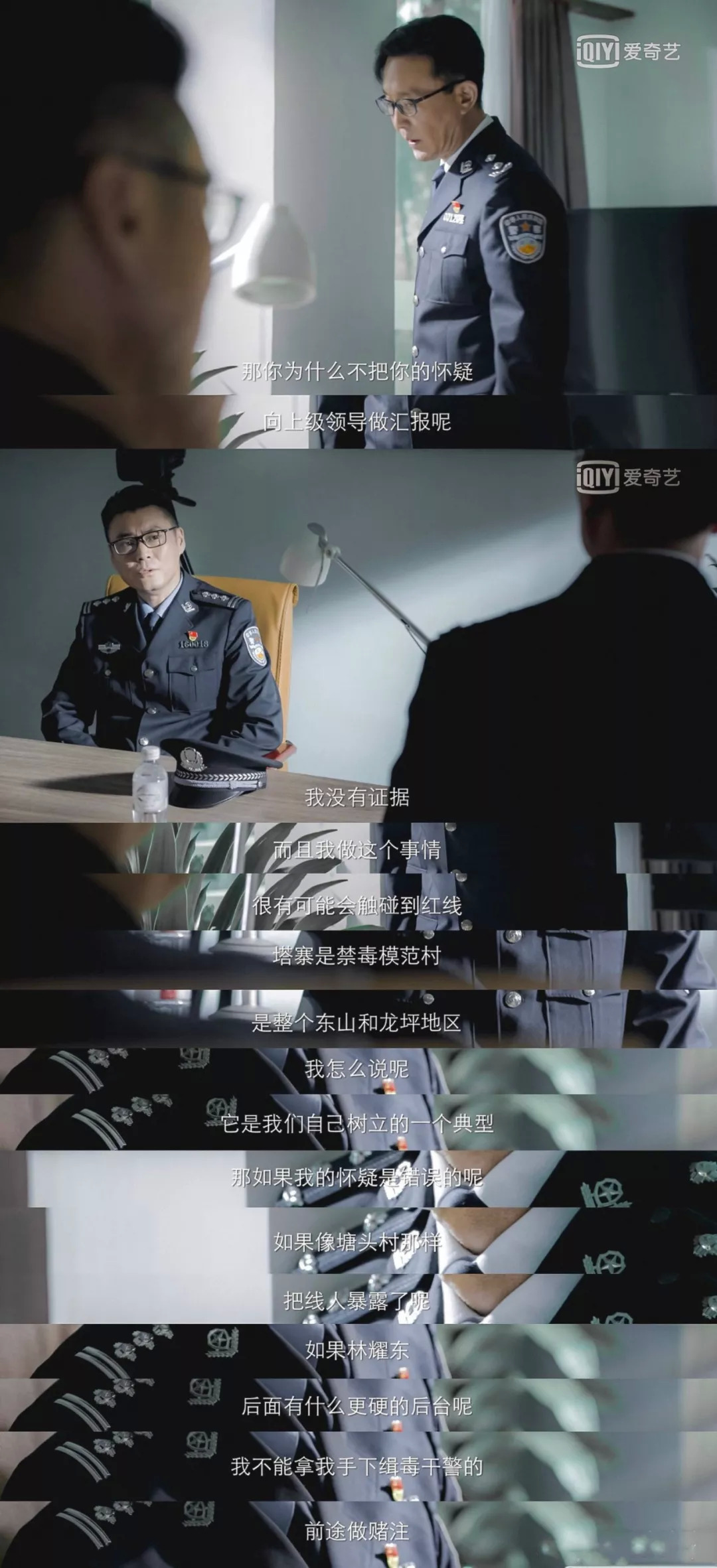 第一个维度,专业层面的套入。比如:其中审核大虾、麻子那场戏。唐旭告诉我们,他们审案是有一套的,吸毒的人容易口渴,对于水的渴望极其强烈。所以,刚开始肯定不会审问,就晾着大虾、麻子,还故意端杯茶,不紧不慢地边吹边喝,其实就是在故意刺激他们。人在极度难以忍耐时,心理防线最易攻破。“都是有理有据的,并非想当然。”