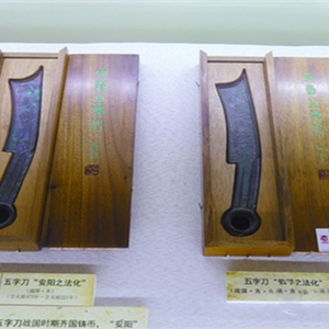 这两枚齐国刀币均为五字刀币,分别写着“安阳之法化”“节墨之法化”。刀币行制精美,篆刻文字纤细扁瘦,铜质红中泛绿,见证了2000多年前齐国精湛的铸造工艺和书法艺术。