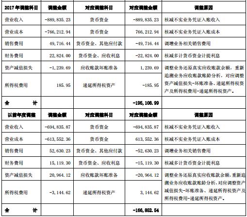 ST康美回复称,经公司自查,由于公司治理、内部控制存在重大缺陷,公司存在使用不实单据和业务凭证造成多计银行存款及收入、未如实反映款项支付等情况,造成前期重大会计差错。同时,ST康美表示,会计差错更正还涉及对2017年以前年度财务报表更正事项(主要调整情况如下图)。