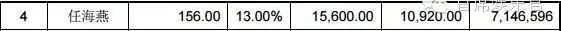 表中可以看到,任海燕得到了1.56亿现金和7146596股,所以:
