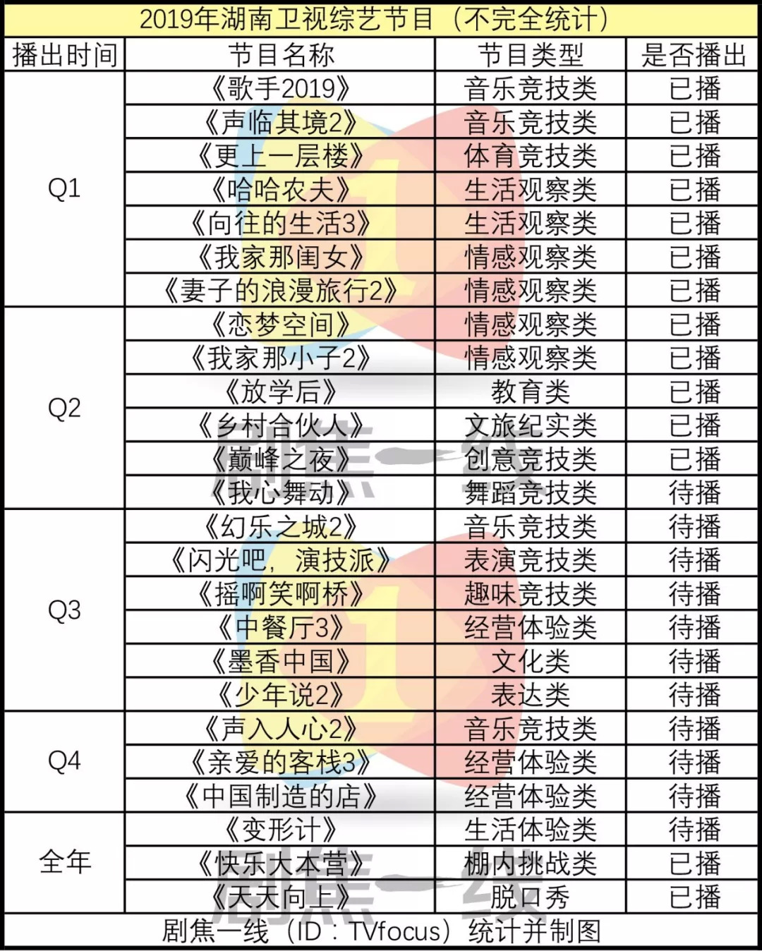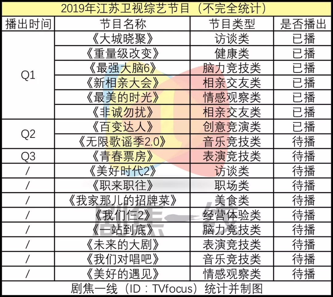 江苏卫视在相亲交友和脑力竞技两个领域建立了自身的品类优势,《非诚勿扰》和《新相亲大会》都是老牌婚恋节目,经典益智类节目《最强大脑6》《一站到底》也都在2019年回归了。