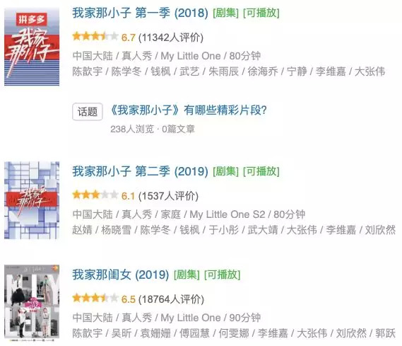 另外,成功带火观察类综艺的“我家那”系列今年也出了《我家那小子2》和《我家那闺女》,口碑都在6分之上。从《我家那小子》到《我家那闺女》,嘉宾架构从母子变为父女,中国式亲子代际情感交流的主题引发观众共鸣,受众覆盖率大。