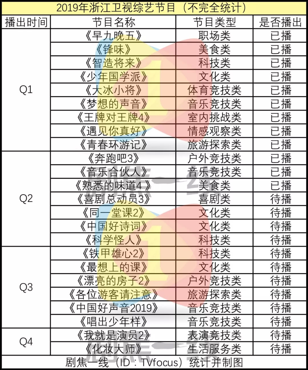 除了《奔跑吧》《锋味》《王牌对王牌》等已受市场认同的优质综艺资源,浙江卫视在2019年开拓了题材,文化类、美食类、音乐类、喜剧类、科技类、户外竞技类等各种品类均有涉猎。