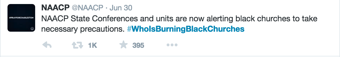 全国有色人种协进会(NAACP)发布推文,警告黑人教堂采取必要的预防措施。在脸书上,该组织称这一系列起火案件是针对黑人组织的“长期的攻击的一部分”。
