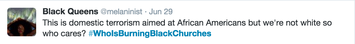 在这些教堂起火事件获得主流媒体密切关注前,美国社交媒体上早已沸沸扬扬。#谁在火烧黑人教堂#(#WhoIsBurningBlackChurches)成了推特上的一个热门标签。是白人至上主义者重新采取了20年前的恐吓策略?还是保守主义者借此回击“降旗”运动?有人想对奥巴马 “真诚回顾”美国种族历史问题的呼吁表达什么态度?