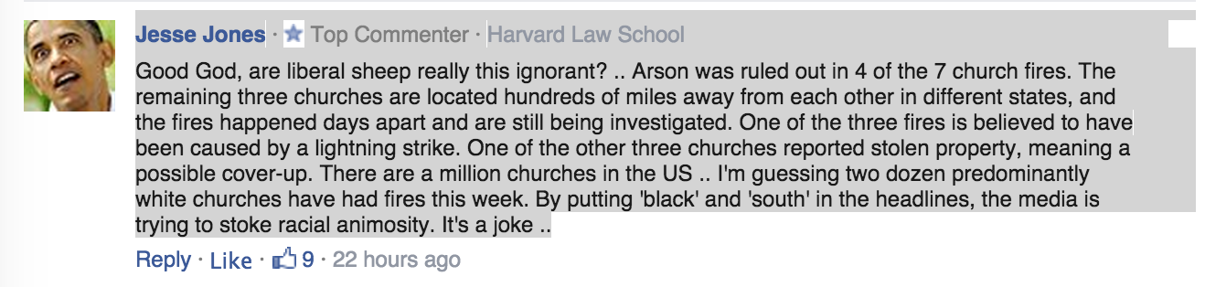 网友Jesse Jones在网站的评论中呼吁美国人能保持理智,不要轻易将黑人教堂起火跟种族主义联系起来。他说媒体时刻意强调“黑人”和“美国南部”的做法是在“激发种族憎恨”。