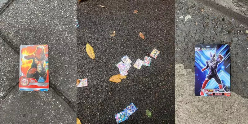 出现在地上的奥特曼卡片大概率是被故意掉丢的。有一次我亲眼看见一个小朋友开卡,撕开一包卡牌后,一边走一边念叨:这张有,这张有,这张有,这种也有,这种没有!