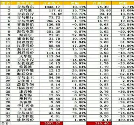 到4月底,青岛共有33家A股上市企业。这33家企业2018年共实现营收3657.37亿元,较2017年增长25.60%,净利润也达到了215.40亿元。其中,青岛海尔、海信电器、青岛啤酒这“三朵金花”,2018年营业额分别为1833.17亿元、351.28亿元、265.75亿元,占据青岛A股上市企业营业额的半壁江山。