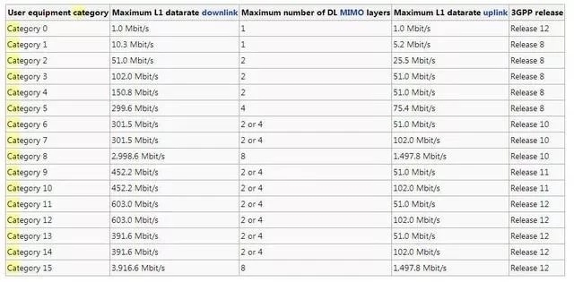 注:这里的Cat并不是猫的意思,是Category的缩写,“种类,分类”的意思。Cat.X说的就是UE-Category,UE是用户设备(User Equipment )。Cat.X这个值就是用来衡量用户终端设备无线性能的,说白了就是用来划分终端速率(等级)的。