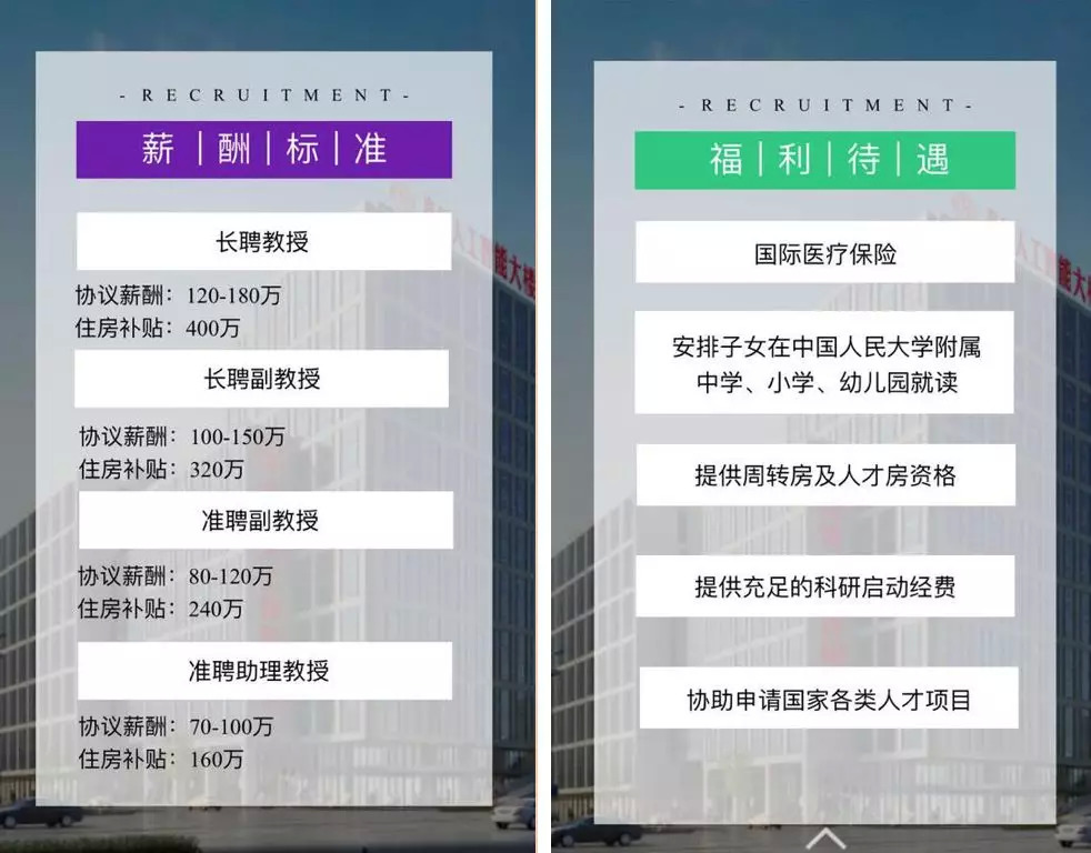 不过比薪酬更吸引人的是一系列优渥的福利待遇,包括:国际医疗保险,安排子女在中国人民大学附属中学、小学、幼儿园就读,提供周转房及人才房资格,提供充足的科研启动经费,协助申请国家各类人才项目。