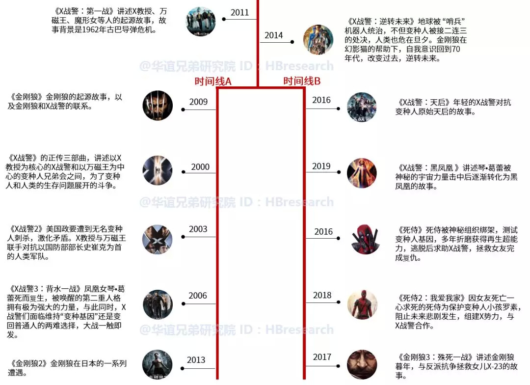 为了让大家更好地理解整体的故事发展,我们按照X战警电影宇宙的时间顺序对12部影片进行梳理,整理出的时间线脉络如下: