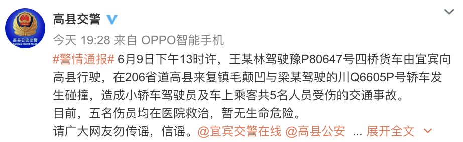四川宜宾高县公安局交通管理大队官方微博9日晚通报:6月9日下午13时许,王某林驾驶豫P80647号四桥货车由宜宾向高县行驶,在206省道高县来复镇毛颠凹与梁某驾驶的川Q6605P号轿车发生碰撞,造成小轿车驾驶员及车上乘客共5名人员受伤的交通事故。