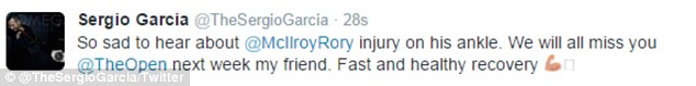 加西亚在推特上祝福麦克罗伊早日康复,并且暗示了后者不大可能参加下周举行的英国公开赛。他说道:“得知你左脚受伤的消息后,我非常难过。你不能参加下周的英国公开赛,我们都感到非常遗憾。希望你早日康复。”